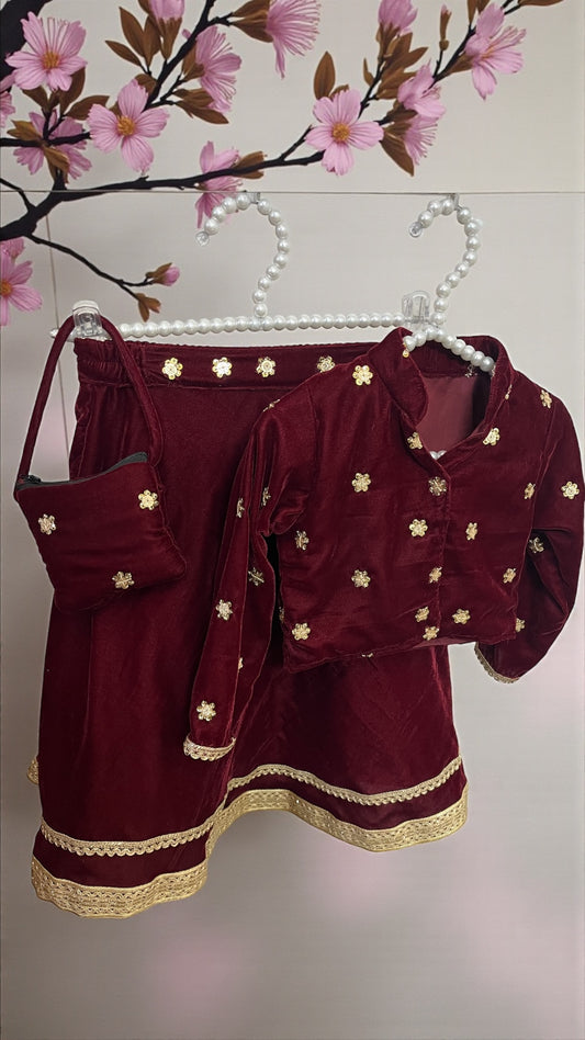 Maroon Blossom Velvet Lehenga Set